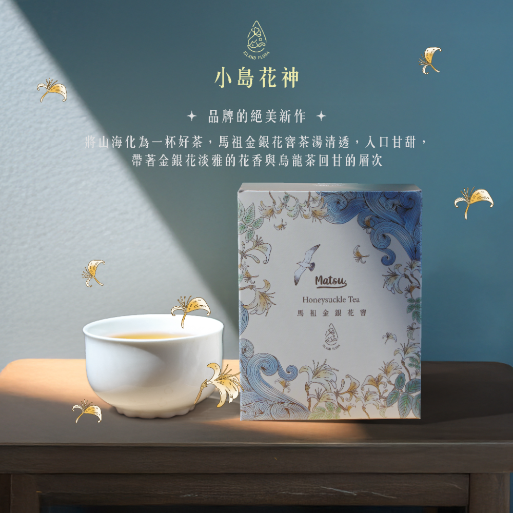 你有喝過這杯夢想成真的茶嗎? 獻給每個追夢者,一杯茶的喘息 馬祖,如金銀般珍貴的金銀花,花期短暫如梭, 鮮花一旦綻放,小農們便需要在清晨晚霞與時間賽跑。 小島花神最新獨家技術,由傳承百年工藝的窨茶專家, 將手工採摘的新鮮金銀花的芬芳與活力,窨入阿里山高山茶的清香甘醇中。 小島花神邀請您Tag 一個正在追夢的朋友, 並留下對追夢者的鼓勵,用行動祝福每一位追夢者。
